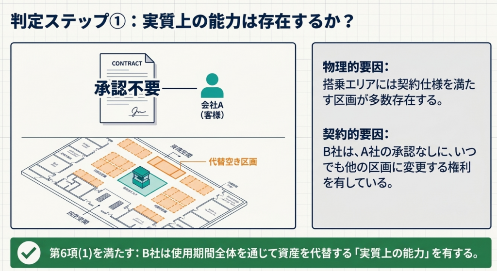 A:代替可能な多くの区画が存在し、かつ契約に基づきサプライヤーが顧客の承認なくいつでも変更できる状況は、「実質上の能力」の要件を満たします。