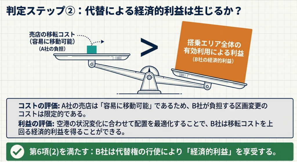 (2) 代替による経済的利益 (第6項(2))A社所有の「容易に移動可能な売店」のため、代替コストが極めて低い。充足