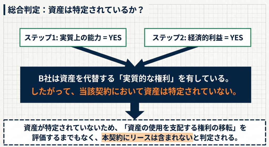 結果として「資産は特定されていない」ことになり、この契約は「リースを含まない」と結論づけられます。