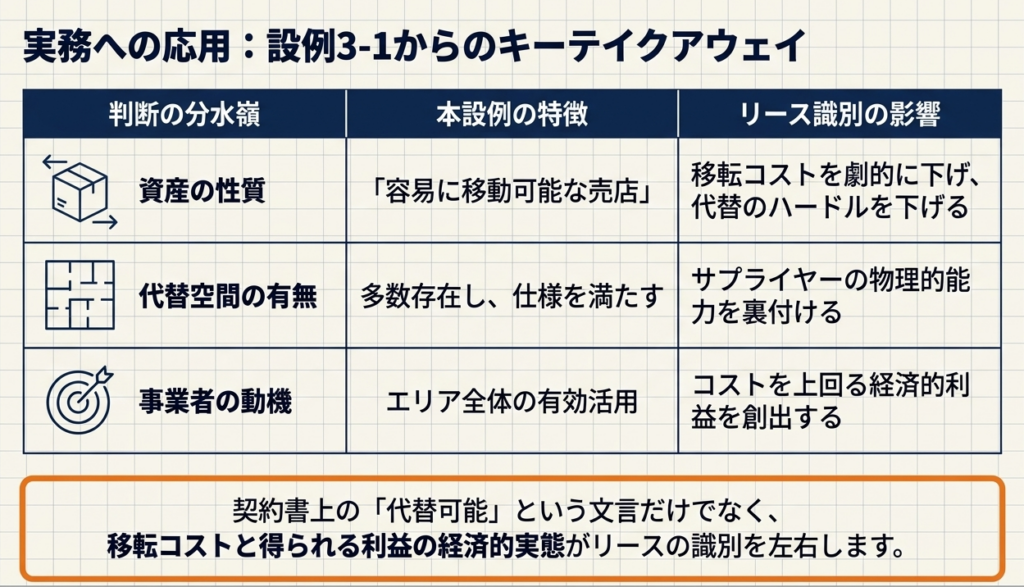 ここで皆様に釘を刺しておきたいのは、この設例を安易に一般の事務所賃貸や店舗賃貸に当てはめてはいけないということです。 例えば[設例 3-2]のような一般的な不動産賃貸では、移転コスト(内装工事費や引越代)をサプライヤーが負担することが多く、経済的合理性のハードルを越えられずに「リースに該当する」と判定されるケースが大半です。本設例は「移動可能な売店」という特殊な条件があるからこそ、この結論に至っている点に留意してください。