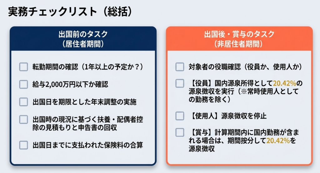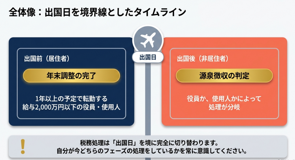 実務担当者が目指すべきゴールは、「出国日を境とした課税ルールの完全な切り替え」です。出国タイミングにより、給与支払者が負うべき義務は以下の通り明確に分かれます。