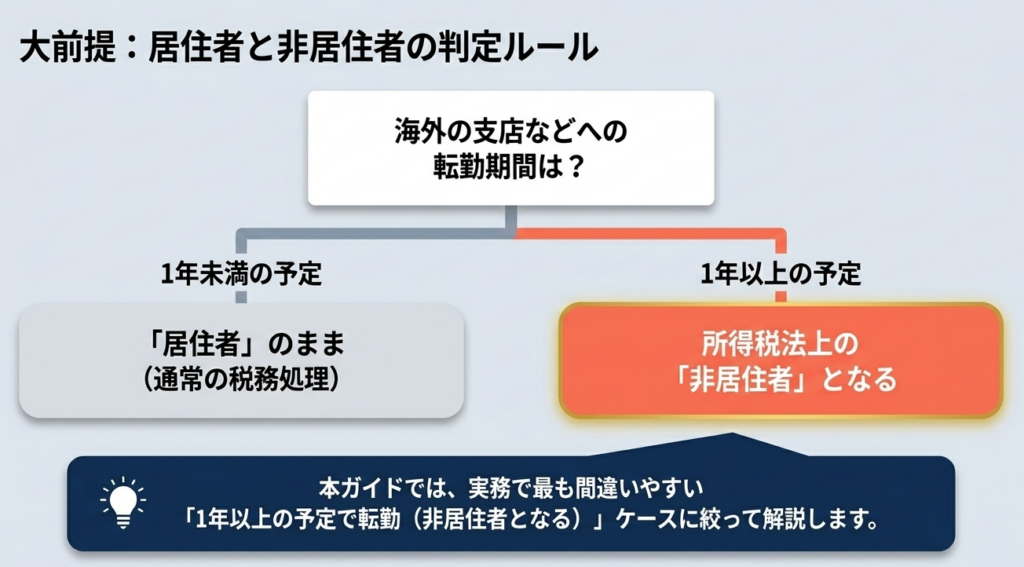 実務上は、辞令や雇用契約書において「1年以上の海外勤務」が明示されていることが、居住性判定の決定的な根拠となります。