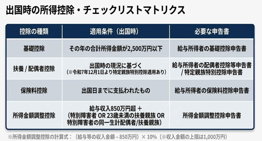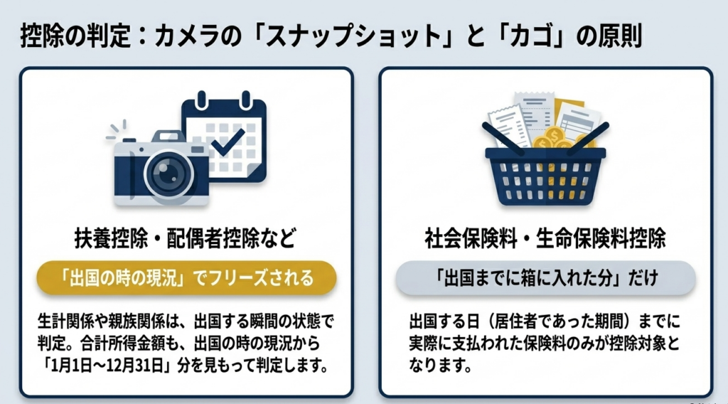 | 社会保険料・生命保険料等 | 支払日基準 | 出国日(居住者期間中)までに「実際に支払った金額」のみ。 |