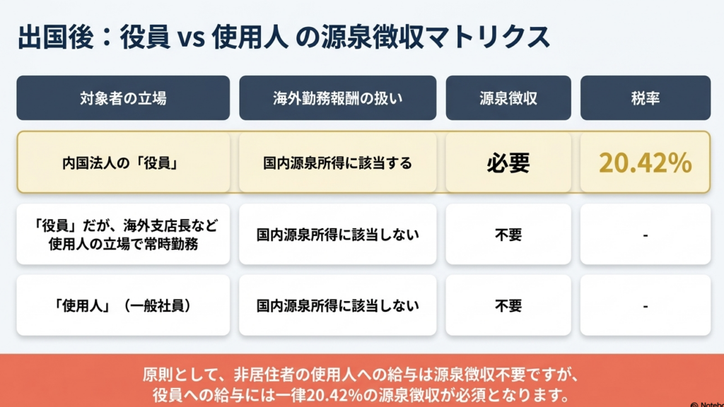 なお、使用人であっても、賞与などで計算期間内に日本での勤務期間が含まれている場合、その日本の勤務に対応する部分には20.42%の源泉徴収が必要になります。