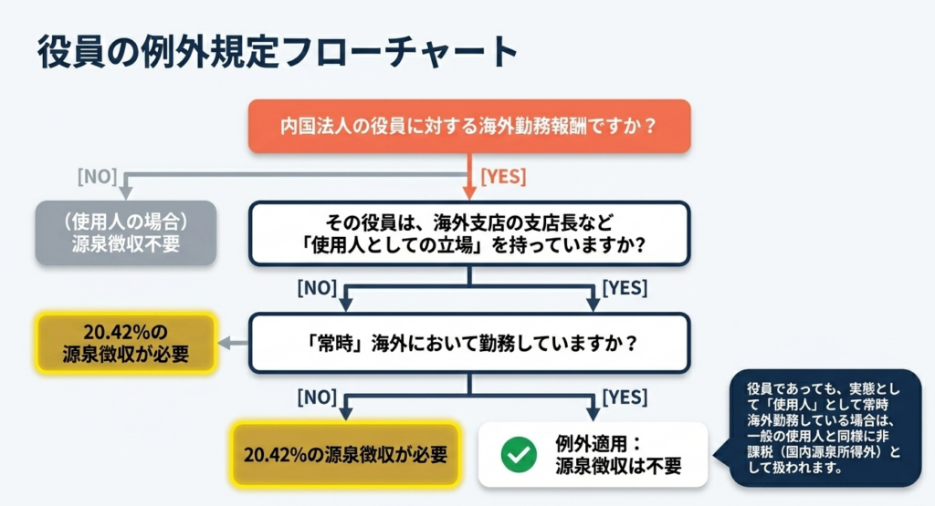 その役員が、海外支店の支店長など、使用人としての立場で常時海外において勤務している場合には、例外として源泉徴収の必要はありません。この場合、その報酬は役員報酬としての性質よりも海外での実務労働の対価として扱われます。