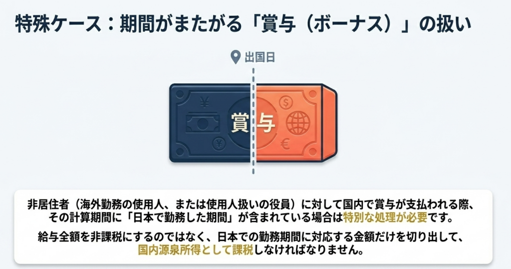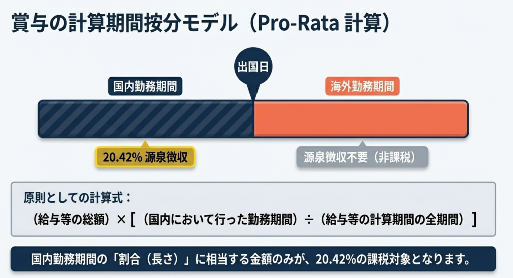 使用人の場合、非居住者期間の海外勤務に対する給与は課税されませんが、**「賞与」**には注意が必要です。計算期間の中に日本での勤務期間が含まれている場合、以下の算式を用いて国内源泉所得分を算出します。