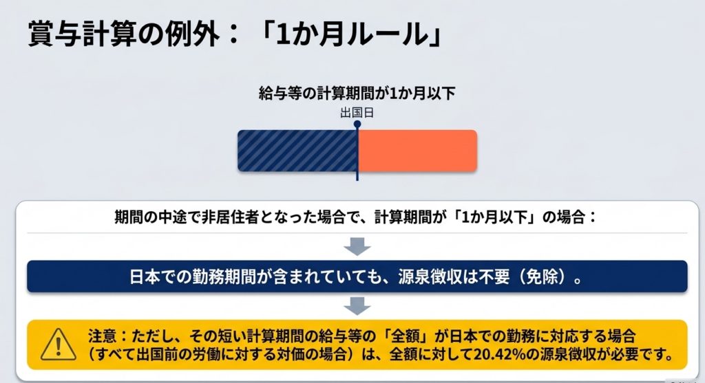 給与計算期間の途中で出国し非居住者となった場合、計算期間が「1か月以下」であれば、便宜上、日本での勤務期間が含まれていても全額を非居住者の給与として扱い、源泉徴収を省略できます。