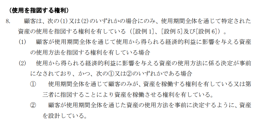 | 資産の稼働に関する権利 | 使用方法が事前決定されている場合に、顧客が資産を動かす(稼働させる)独占的な権利を有しているかどうかを指す。 |