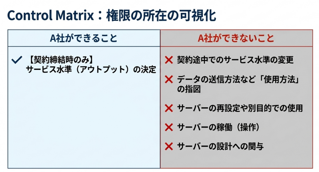 この契約では、顧客(A社)は契約時にサービス水準を決定できるのみで、サーバーの具体的な使用方法(データの送信方法や再設定など)を指図する権利を持っていません。また、サーバーを自ら稼働する権利を持たず、設計に関与した事実もありません。