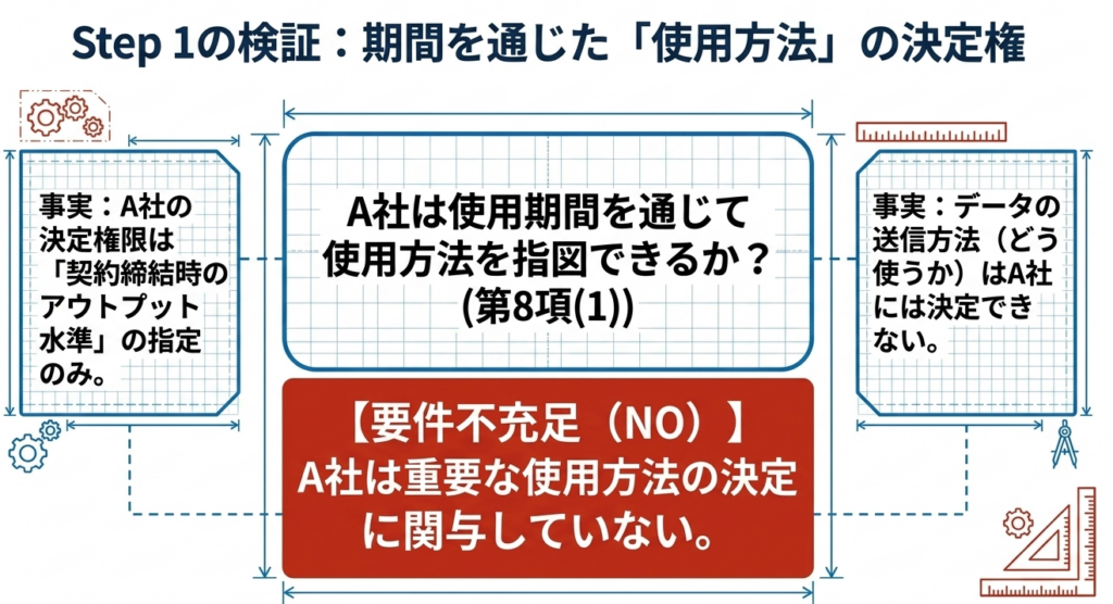 ・使用実態: A社はデータの送信方法、サーバーの再設定、他の目的での使用といった「重要な決定」は行わない。また、設計に関与しておらず、稼働する権利も持たない。