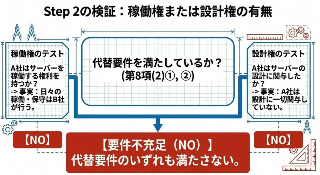 のいずれかである必要があります。しかし、本設例ではA社に稼働権限はなく、設計にも関与していないため、この要件も満たしません。