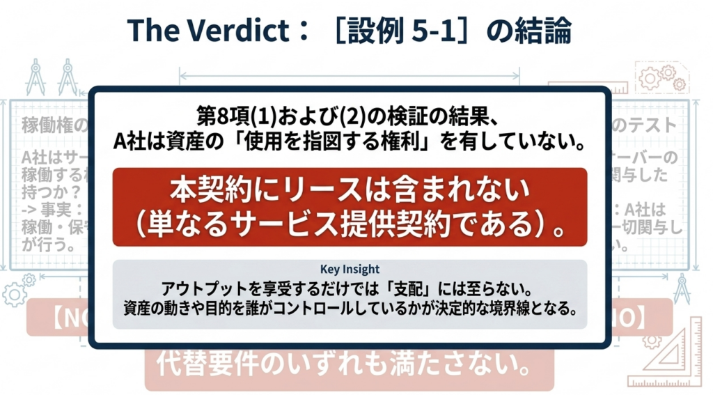 結果として、資産の使用を支配する権利が顧客に移転していないため、他の要件を検討するまでもなく、この契約は「リースを含まない」と結論づけられます。