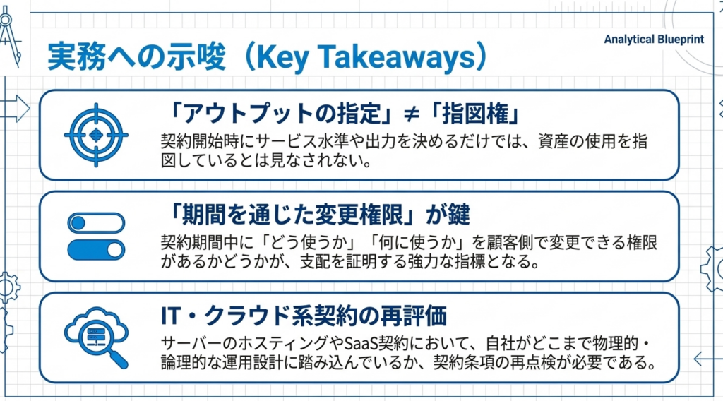 複雑な契約が増加するIT社会において、本設例のような「指図権」の緻密な検証は、信頼性の高い財務諸表作成への不可避なプロセスです。