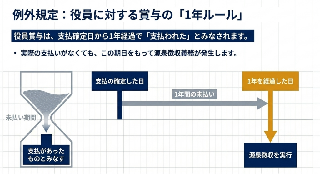 「支払」というトリガーがない限り、源泉徴収義務そのものが発生しません。 - 役員賞与が未払の場合:支払確定日から1年を経過した日に、強制的に源泉徴収を行う。