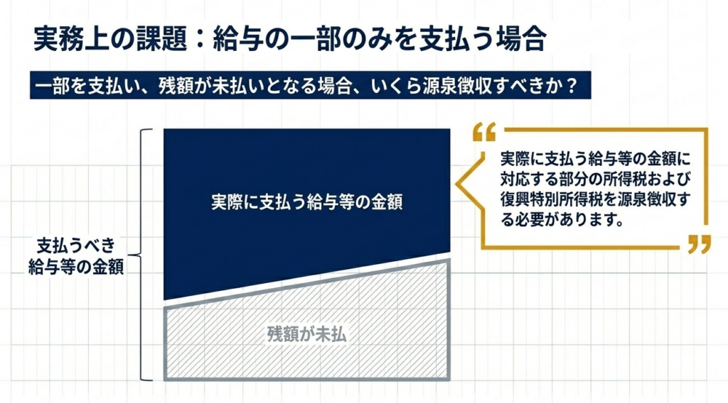 3. 給与の一部のみが支払われ、残額が未払となる場合の源泉徴収の考え方を述べてください。