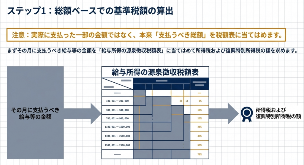 その月に支払うべき「総額(額面)」をベースに、「給与所得の源泉徴収税額表」を適用し、本来徴収すべき所得税および復興特別所得税の合計額を算出します。