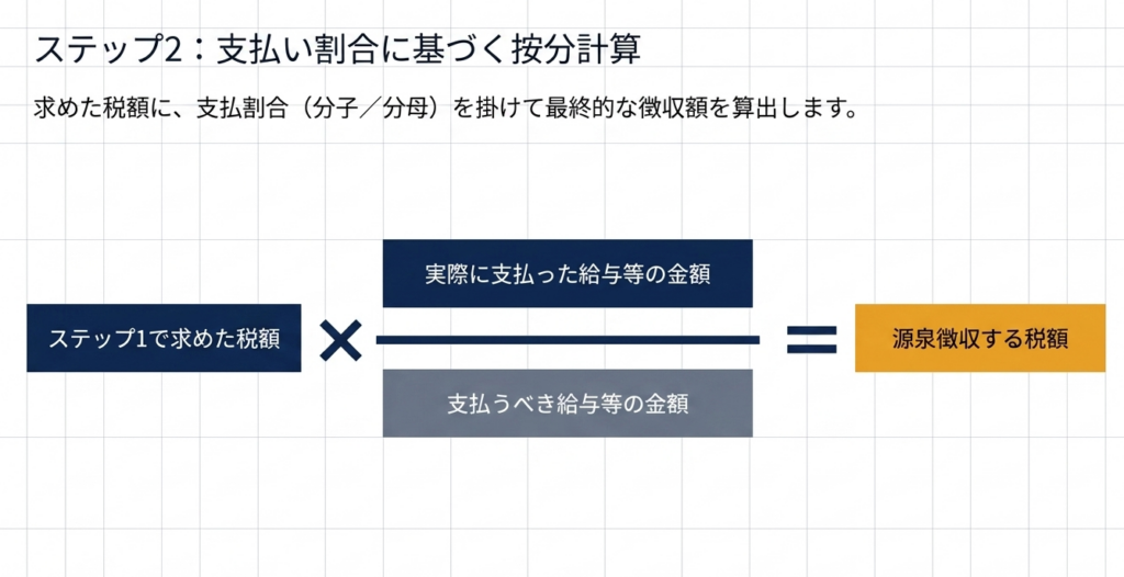 源泉徴収税額 = (支払うべき総額に対する税額) × (実際に支払う金額 / 支払うべき総額)