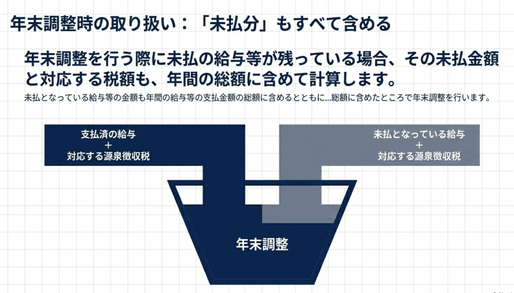 年末調整においては、12月31日時点で未払であっても、その年に支払われるべき給与(未払分)をすべて「年間の給与等の支払金額の総額」に含めます。