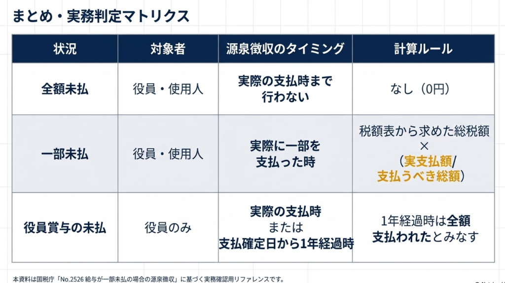 - 全額が未払の場合:原則として、源泉徴収は行わない。